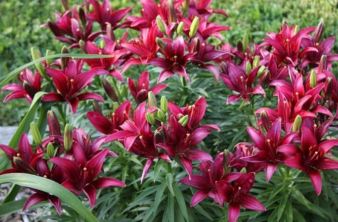 Лилии. Подходят для любого цветочного оформления участков. Низкорослые сорта и виды используют для посадок на бордюрах, высокие лилии используют для оформления дальнего плана и в солитерных посадках. Хороши они в группах, посаженные куртинами на газоне. Красиво смотрятся на фоне деревьев и кустарников и в сочетании со многими однолетниками и многолетниками. Некоторые низкорослые лилии можно применять для оформления каменистых участков.Используя при оформлении цветников лилии разного срока цветения, можно ими любоваться с июня до середины сентября.