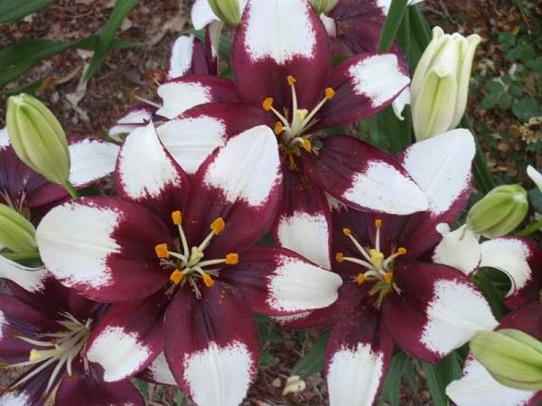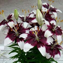 Лилия Tiny Padhye (Тайни Падхай). Очень эффектный новый сорт для выращивания в горшках или на переднем плане бордюров и клумб. Окраска двухцветная: центр густо-винный, верхняя половина лепестка беля. При невысоком росте (40 см) имеет очень крупные цветки (15 см) и обильно цветет. Цветки обращены вверх.