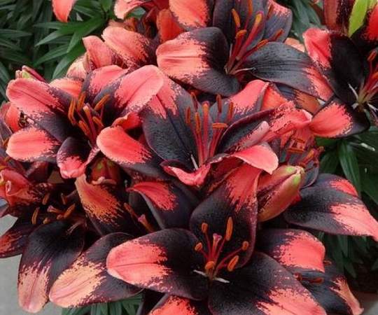 Лилия Tiny Shadow (Тайни Шэдоу). Сорт отлично подходит для посадки в горшки. Высота до 40 см. Цветки крупные, необычно окрашенные - лепестки землянично-красные, основание черно-пурпурное. На черном фоне красиво выделяются коралловые пыльники.