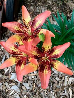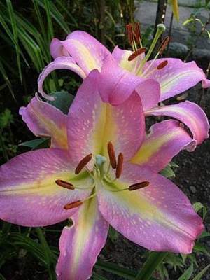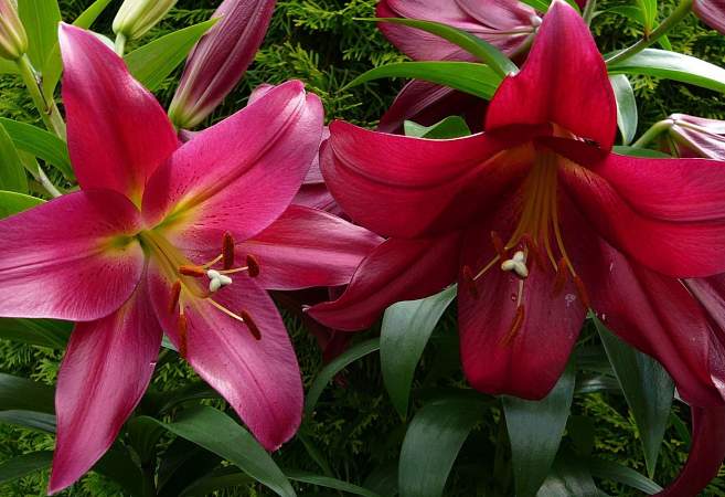 Лилии. Подходят для любого цветочного оформления участков. Низкорослые сорта и виды используют для посадок на бордюрах, высокие лилии используют для оформления дальнего плана и в солитерных посадках. Хороши они в группах, посаженные куртинами на газоне. Красиво смотрятся на фоне деревьев и кустарников и в сочетании со многими однолетниками и многолетниками. Некоторые низкорослые лилии можно применять для оформления каменистых участков.Используя при оформлении цветников лилии разного срока цветения, можно ими любоваться с июня до середины сентября.