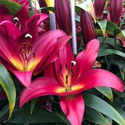 Лилия Touchstone (Тачстоун). Цветки очень крупные (25 см), ярко-рубиновые с желтой звездочкой в центре. Аромат сильный. Высота 140 см.