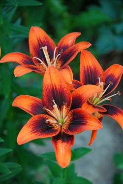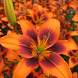 Лилия Twosome (Тусам). Серия Биколор. Цветки глянцевые, крупные, ярко-оранжевые, с темно-бордовым пятном по центру. Сорт удачно впишется в дизайн любого сада! Размножение дочерними луковицами, чешуйками, бульбочками из пазух листьев. Предпочитает светлые места или полутень. Лилия неприхотлива, морозостойка, устойчива к болезням и вредителям.