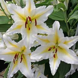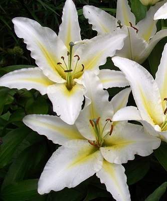 Восточные гибриды. Лилии поразительной красоты, их называют аристократами в мире лилий за экзотическую красоту необычайно привлекательных ароматных цветков. Цветки очень крупные, просто огромные, экзотических окрасок: бело-розовые, белые, малиновые, розовые с крапинками и полосками по центру волнистых лепестков или без них. Цветут в июле-сентябре. Необходимо солнечное место, хорошо защищенное от ветра, поскольку растения высокорослые с очень крупными цветками. Могут также расти в лёгкой тени деревьев. Главное правило — глубокая посадка, не менее 15 см, для защиты луковиц зимой.
