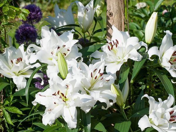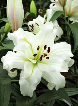 Лилии. Подходят для любого цветочного оформления участков. Низкорослые сорта и виды используют для посадок на бордюрах, высокие лилии используют для оформления дальнего плана и в солитерных посадках. Хороши они в группах, посаженные куртинами на газоне. Красиво смотрятся на фоне деревьев и кустарников и в сочетании со многими однолетниками и многолетниками. Некоторые низкорослые лилии можно применять для оформления каменистых участков.Используя при оформлении цветников лилии разного срока цветения, можно ими любоваться с июня до середины сентября.