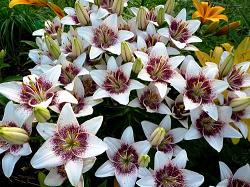 Лилии. Подходят для любого цветочного оформления участков. Низкорослые сорта и виды используют для посадок на бордюрах, высокие лилии используют для оформления дальнего плана и в солитерных посадках. Хороши они в группах, посаженные куртинами на газоне. Красиво смотрятся на фоне деревьев и кустарников и в сочетании со многими однолетниками и многолетниками. Некоторые низкорослые лилии можно применять для оформления каменистых участков.Используя при оформлении цветников лилии разного срока цветения, можно ими любоваться с июня до середины сентября.