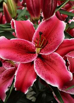 Лилия восточная Zorro (Зорро). Цветок огромный (25 см в диаметре), красновато-малиновый. По краю лепестков тонкая белая кайма. Есть малиновый крап. Высота до 110 см.