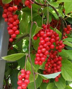 Лимонник китайский. Лиана, достигающая 10-15 м в высоту. Годовой прирост до 1-1,5 м. Предпочитает солнечные и влажные места, на одной кисти от 10 до 40 съедобных ягод красного цвета диаметром 5-10 мм, созревают в конце сентября-октябре. Ягоды очень полезны.