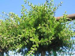 Очень интересный сорт лиственницы с шаровидной кроной и ярко зеленой хвоей. Все ветви растут вверх, густые, декоративны и в зимний период, предлагается в основном как штамбовое деревце. Диаметр кроны взрослого растения 1.5 м. Иглы мягкие, светло-зеленые, вырастающие ранней весной, осенью желтеют и опадают.