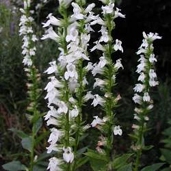 Лобелия синяя White Selection (Вайт Селекшен). Многолетнее растение. Может достигать 60-90 см высоты. Стебли облиственные. Цветки белые, собраны в плотные колосовидные соцветия и появляются в середине лета. Растение зимостойко в средней полосе России, но в бесснежные зимы может подмерзать, нуждается в мульчировании.