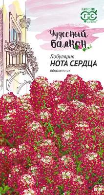 Лобулярия Нота сердца. В озеленении балконов миниатюрная лобулярия пользуется заслуженной популярностью. Ее высаживают между крупными растениями для придания цветочному "ансамблю" необходимого объема. Кустики низкие, всего 10-12 см высотой, густоветвящиеся, с мелкими ланцетными листьями. Цветки мелкие, 3-4 мм в диаметре, собраны в соцветия красно-розового цвета, сплошь покрывают кусты во время цветения. Цветет с конца июня до октября. Светолюбива, на питательных почвах "жирует" в ущерб цветению, при засухе цветение прекращается. Посев на рассаду проводят в марте. Высаживают в балконные ящики в мае через 10-15 см. Удивительно сочетается со многими цветущими растениями. Удаление отцветших цветков продлевает ее цветение.