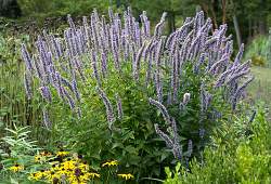 Лофант анисовый Blue Fortune (Блу Фотчен). Длительно цветущий, зимостойкий, неприхотливый многолетник. Высокорослое растение, формирует кусты высотой до 100 см, в ширину разрастается до 40-60 см. Стебли прямостоячие, четырехгранные, облиственные. Листья схожи с листьями мяты. Черешковые, зубчатые, до 10 см в длину и до 4,5 в ширину.