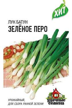 Лук батун Зеленое перо на зелень. Раннеспелый урожайный сорт, пригодный для получения ранней зелени во всех регионах России. Рекомендуется для выращивания на садово-огородных участках, в приусадебных и фермерских хозяйствах. Формирует луковицу с компактной зеленой розеткой листьев. Листья среднего размера, сочные, нежные. Вкус полуострый. Рекомендуется для использования в ежедневном рационе в свежем виде в салатах и винегретах, супах, для украшения закусок. Зеленый лук добавляют в овощные, мясные и рыбные блюда, а также к мясному фаршу, в начинку пирогов, разнообразные соусы, маринады. Его можно замораживать и использовать в зимний период как поливитаминную зелень. Посев семян непосредственно в открытый грунт производят в конце апреля — начале мая, на глубину 1,0-1,5 см по схеме 4-5 х 10-15 см. Сбор урожая начинают в конце июня — начала июля, когда листья достигнут высоты 20-30 см.