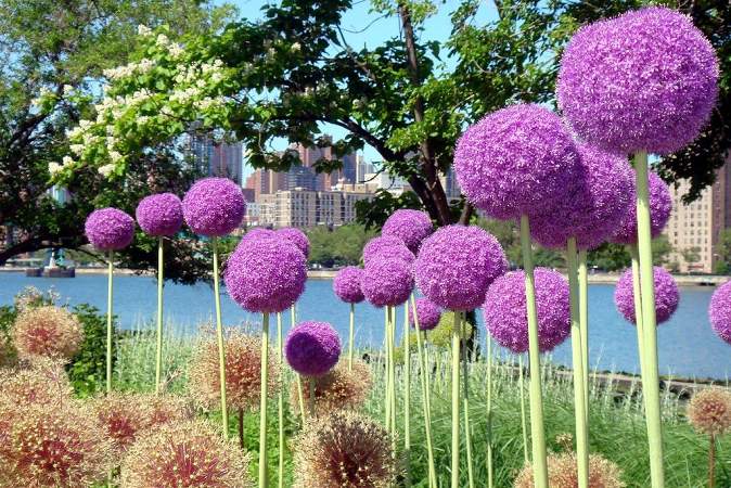 Лук декоративный Lucy Ball (Люси Болл). На высоких стрелках, до 1 м, располагаются некрупные соцветия диаметром 5-8 см, в которые собраны 50-100 душистых звездчатых темно-лавандовых цветков. Это растение часто культивируют на срезку, причем используют не только соцветия, но и красивые блестящие листья.