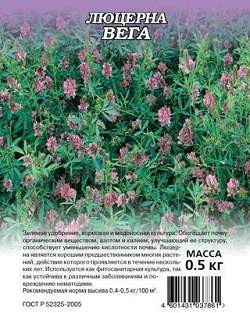 Люцерна Вега 0,5 кг. Зеленое удобрение, кормовая и медоносная культура. Обогащает почву органическим веществом, азотом и калием, улучшающий ее структуру, способствует уменьшению кислотности почвы. Люцерна является хорошим предшественником многих растений, действие которого проявляется в течение нескольких лет.
