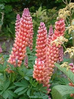 Люпин Salmon-Red (Салмон-Ред). Растение достигает высоты 60-90 см. Окраска лососевая с красным. Люпин — яркий неприхотливый многолетник. Красив в массивах. Отлично обогащает почву азотом. Прекрасный партнер для большинства многолетников. Великолепен в сочетании с высокими бородами ирисами и ирисами-интермедиа.
