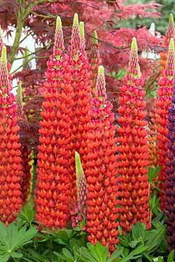 Люпин West Country Beefeater (Вест Кантри Бифитр). Двухцветный. Совершенно новая окраска для люпинов, подобного оттенка еще не было. Кораллово-красно-оранжевый с желтой губой. Очень высокие цветоносы. После обрезки цветет повторно до осени.