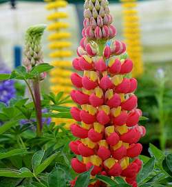 Люпин West Country Tequilla Flame (Вест Кантри Текила Флейм). Очень яркий. Биколор. Красный с желтой губой. Соцветия очень высокие, на прочных стеблях. Цветет повторно после обрезки, до глубокой осени.