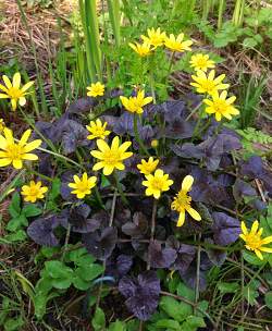 Лютик весенний Brazen Hussy (Бразен Хасси). В зарубежной литературе это растение относят к роду лютик (Ranunculus ficaria). Однако отечественные цветоводы чаще всего называют его чистяк (Ficaria). Глянцевые пурпурно-коричневые листья, жёлтые цветки. Разрастается легко, но не доставляет никаких хлопот, поскольку является эфемероидом и после цветения исчезает. Образует живописные ковры, чрезвычайно неприхотлив. Отличное растение для оживления весеннего сада. Цветет в мае.