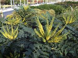 Магония Winter Sun (Винтер Сан). Вечнозелёный вертикально растущий, слаборазветвлённый кустарник с толстыми скелетными ветвями. Листья расположены очерёдно, непарноперистые, состоят из 21 листочка, узко яйцевидные, длиной 10 см, острозубчатые, сверху зелёные, снизу светлее. Осенняя окраска старых листьев жёлто-оранжево-красная.