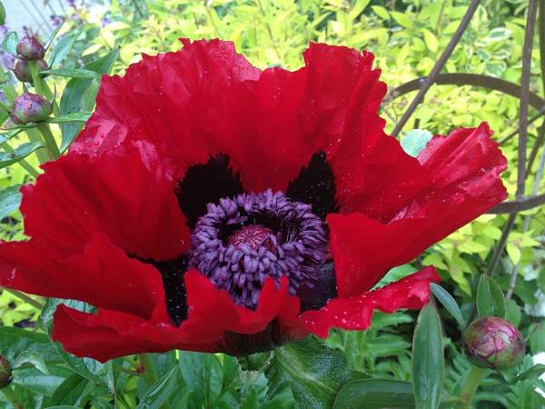 Мак восточный Beauty of Livermere (Бьюти оф Ливермер). Цветок очень привлекательный, темно-красный с черным пятном. Лепестки шелковистые, жатые. Цветонос устойчивый. Этот мак с классической окраской — великан среди своих сородичей, его высота достигает 120 см.
