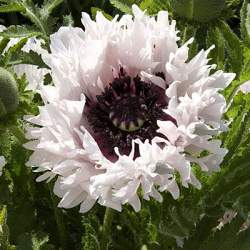 Мак Miss Piggy (Мисс Пигги). Цветок крупный, полумахровый, бело-розовый. Лепестки узкие, загибаются в разные стороны, расположены в несколько рядов.