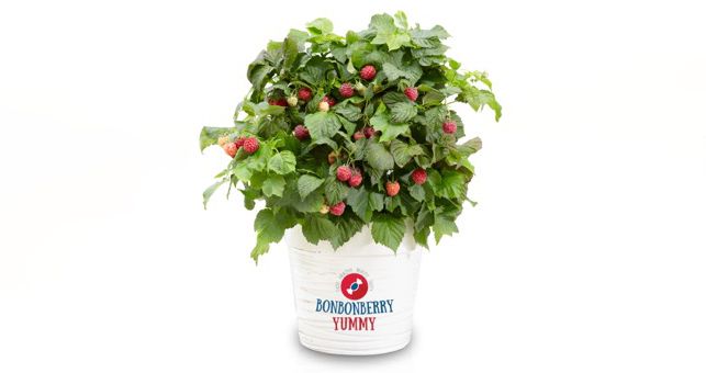 Малина Бонбонберри Ямми. Карликовый голландский сорт со светло-зелёной листвой. Хорошо подходит для выращивания в контейнерах на балконах и террасах. Плодоношение на побегах текущего года. Куст компактный, высотой 50 см. Побеги почти без шипов. Цветки белые. Цветение в июне. Ягоды красные, созревают в августе. Вкус сладкий.