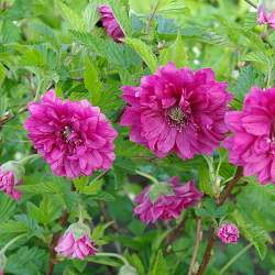 Малина великолепная Flore Pleno (Флоре Плено). Эффектный кустарник с махровыми пурпурными цветами (5 см диаметром), цветет в апреле-мае. Побеги дугообразные, слегка колючие. Образует густой округлый куст высотой 1,2-1,8 м.Листья пальчатые (состоят из 3 листочков), до 15 см длиной, глянцевые, ярко-зеленые. Зона 4.
