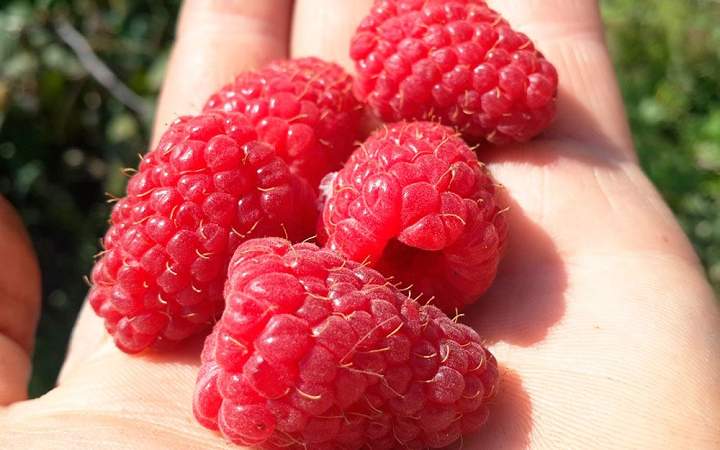 Малина Геракл. Куст средний, пряморослый, слабораскидистый. Побеги коричневые, прямые, со средней шиповатостью.