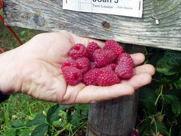 Малина Joan J (Джоан Джей). Ремонтантный сорт малины английской селекции, выведенный известным учёным Дереком Л. Дженнингсом. Кусты средней силы роста, высотой от 1 до 1,5 метра. Стебли толстые, мощные, хорошо разветвлены. Большой плюс, что побеги абсолютно гладкие — без каких-либо шипов, светло-зелёного цвета, прямостоячие.