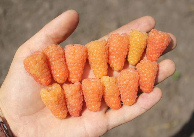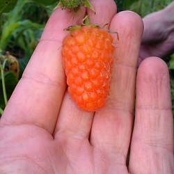 Малина Оранжевое Чудо. Сорт устойчив к болезням и вредителям. Куст высокий, мощный, среднераскидистый. Побегообразовательная способность высокая. Ягоды крупные, массой до 7 г, красивой удлиненно-конической формы, плотные, транспортабельные. Мякоть нежная, кисло-сладкая, с ароматом.
