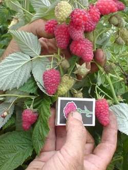 Цветки малины необыкновенно красивы. Ярко-красные или почти рубиновые крупные ягоды имеют пьянящий аромат и превосходный вкус, крепко держаться за плодоножки и не осыпаются. Но, несмотря на это, собирать поспевшие ягоды легко. Каждая ветка дает до 20 штук удлиненных плодов весом от 5 до 15 г и от 5 до 7 см длиной. С одного куста можно собрать до 4 кг ягод.