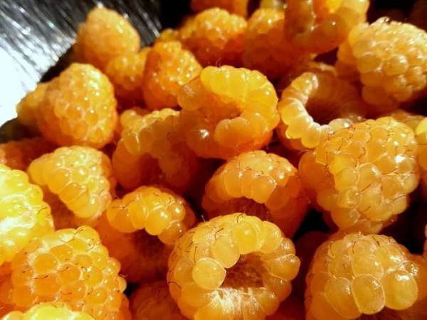 У малины Желтый гигант ягоды массой 4-6 г, желтые, тупоконические, плотные, семена крупные, мякоть сладкая, с приятным ароматом. Великолепны для десерта.