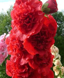 Мальва Chater's Double Scarlet (Чейтерс Дабл Скарлет). Махровые ярко-красные цветки-помпоны! Стебли мощные ветвистые от самого основания. Листья крупные, лопастные, по краю зубчатые, до 10 см в поперечнике. Стебли и листья шершаво-волосистые. Цветки крупные, махровые, до 12 см в диаметре, ширококолокольчатые, собраны в длинные кистевидные соцветия, насчитывающие иногда до 150 цветков.