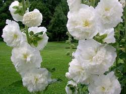 Мальва Chater's Double White (Чейтерс Дабл Вайт). Махровые белые цветки-помпоны! Стебли мощные ветвистые от самого основания. Листья крупные, лопастные, по краю зубчатые, до 10 см в поперечнике. Стебли и листья шершаво-волосистые. Цветки крупные, махровые, до 12 см в диаметре, ширококолокольчатые, белые, собраны в длинные кистевидные соцветия, насчитывающие иногда до 150 цветков.