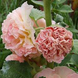 Мальва Peaches and Dreams (Пичес энд Дримз). Стебли мощные ветвистые от самого основания. Листья крупные, лопастные, по краю зубчатые, до 10 см в поперечнике. Стебли и листья шершаво-волосистые. Цветки крупные, махровые, до 12 см в диаметре, ширококолокольчатые, персиковые, иногда с розовым оттенком, собраны в длинные кистевидные соцветия, насчитывающие иногда до 150 цветков.