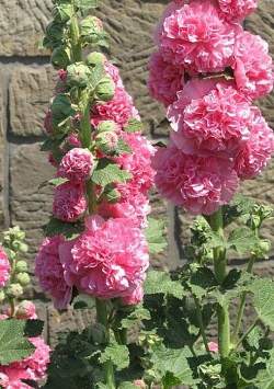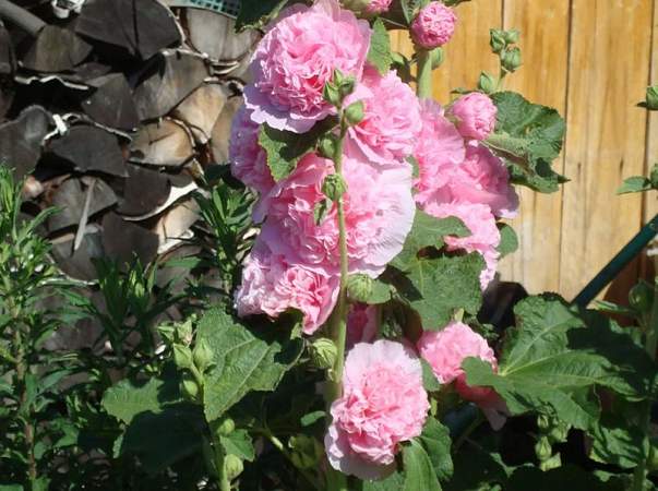 Мальва Розовые Кружева. Цветет с конца июня по сентябрь. Цветки махровые, розовые, 8-12 см в диаметре, собраны в крупное эффектное соцветие. Светолюбива и засухоустойчива, к почвам нетребовательна, но предпочитает участки с хорошо обработанной плодородной почвой.