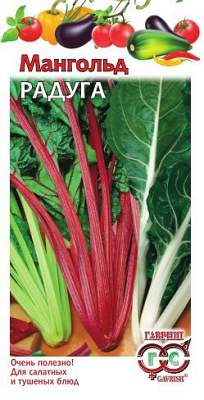 Мангольд смесь Радуга. Великолепная смесь сортов разноцветных форм мангольда. Растения холодостойкие, влаголюбивые, быстрорастущие. Всего через 30-40 дней от появления массовых всходов они пригодны для получения пучковой продукции, а за 80-90 дней достигают товарной спелости. Розетка листьев прямостоячая, высотой 50-70 см. В пищу используют листья и черешки. Листья используют для приготовления голубцов. Черешки маринуют, тушат, делают икру, а также получают сок, который применяют для лечения болезней крови. Урожайность листьев и черешков в открытом грунте 3,0- 5,5 кг/м2. Посев проводят в открытый грунт в начале мая на глубину 2,5 см. Рекомендована многократная срезка.