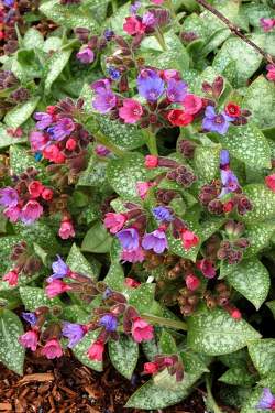 Медуница Dark Vader (Дарк Вейдер). Достаточно крупная медуница. Большие распростертые сине-зеленые листья с яркими серебристыми пятнами. Цветки — розовые, сиреневые, кобальтово-синие, воронковидные. Великолепный пейзажный солист и партнер. Предпочитает тень, полутень и богатые влагоемкие почвы.