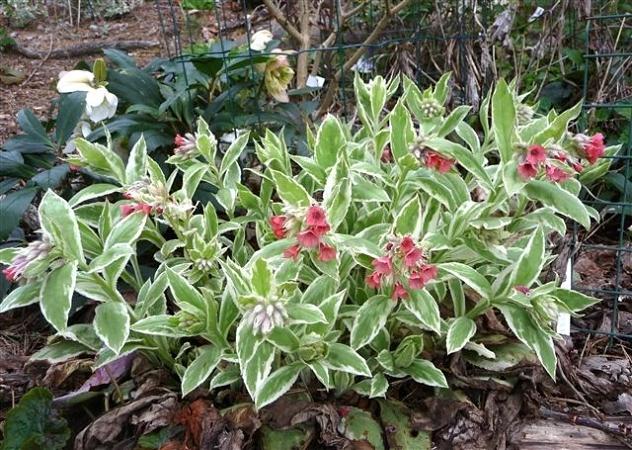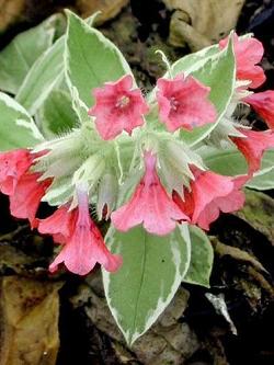 Медуница David Ward (Давид Ворд). Высота растения 40 см, листья крупные, голубовато-зеленые, с четкой белой каймой, цветки розово-красные. Хорошо чувствует себя в тени.
