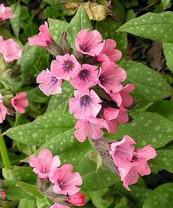 Медуница Dora Bielefeld (Дора Бильфельд). Листья ярко-зеленые с серебристо-серыми пятнами, 10-12 см в длину. Цветки светло-розовые, со временем приобретают голубоватый оттенок. Предпочитает тень, полутень. Цветет чрезвычайно обильно.