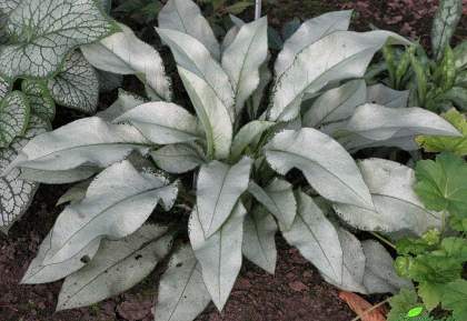 Медуница Majeste (Маджести). Высота многолетника около 30 см. Листья длиной до 30 см серебристо-серые с узкой зеленой каймой. Цветки розово-голубые. Существует легенда, что синие цветки пульмонарии — это цветки Адама, а розовые — цветки Евы. Две различные окраски цветков на одном растении символизирует единство противоположностей.