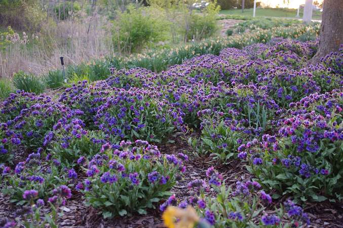 Медуница микс сортов. Темно-зеленые листья украшены узором из серебристых пятен, окраска венчиков меняется с ярко-розовой на фиолетовую и синюю.