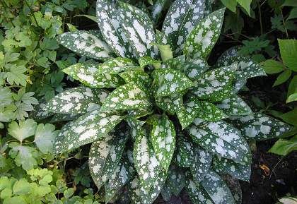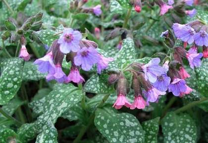Медуница Mrs Moon (Миссис Мун). Темно-зеленые листья украшены узором из серебристых пятен, окраска венчиков меняется с ярко-розовой на фиолетовую и синюю.