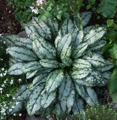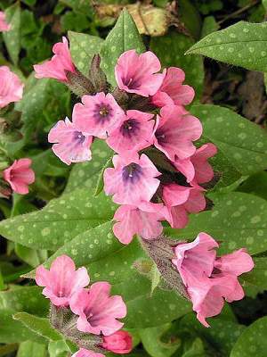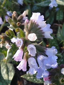 Медуница Opal (Опал). Редкая по красоте медуница — таинственная, загадочная. Листья длинные, овальные, серо-зеленые с белым узором из пятен и штрихов. Рисунок на листьях удачный, гармоничный. Цветки опалово-голубые, розоватые, сиреневатые. Цветение обильное, даже в тени. Разрастается быстро, создает изысканные куртины. Хороша с папоротниками, хостами, как подсадка к хвойным среднего размера. Везде уместна.