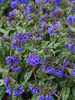 Медуница Smokey Blue (Смоки Блю). Листья длинные красивые, тёмно-зелёные, густо-пятнистые, цветки вначале дымчато-голубые, затем розовые. Высота растения 65 см. Цветение в мае. Зона зимостойкости: 3 (-40 °С).