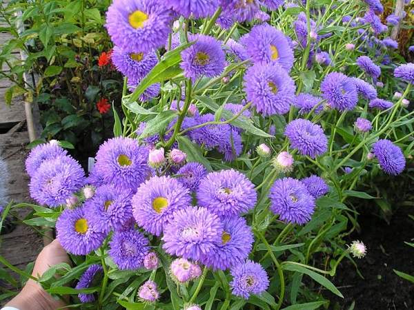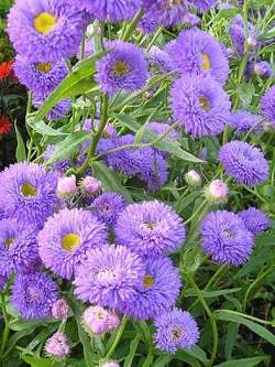 Мелколепестник Azurfee (Азурфи). Растение высотой около 40-60 см. Цветки очень красивые, махровые, фиолетового цвета с желтым центром. Обильное цветение. К почве растение не требовательно, но лучше растет на удобренной, хорошо дренированной.