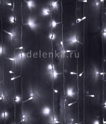 Мерцающий занавес (Прозрачный провод, 1х2 м). Предназначен для декоративного оформления различных плоскостей: витрин магазинов, фасадов зданий, оконных проемов, для декорирования объемных форм (колонны, козырьки, перила, входные группы). Идеально подходит для светодизайна как внутри, так и снаружи помещений. Возможность последовательного соединения, низкое электропотребление и несложный монтаж делают световой занавес одним из самых популярных средств в области декоративного светового оформления.