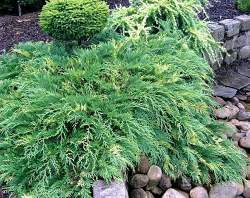 Микробиота перекрестнопарная Gold Spot (Голд Спот). Очень декоративный раскидистый низкий кустарник для тенистых мест, к 10-ти годам высота 50 см, ширина 150 см, внешне напоминает стелющиеся формы туи, хвоя при растирании с лёгким запахом, зелёная с кремовыми пятнами, осенью становится фиолетово-жёлтой, используется для каменистых горок, для декорирования склонов, бордюров, окаймления газонов, зона 3 (до -34 °С).
