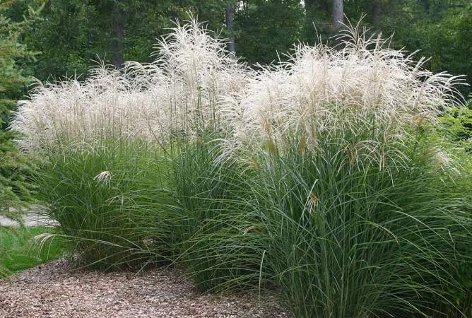 Мискантус китайский Graziella (Грациелла). Роскошный и неприхотливый злак. Высота до 150 см. Метелки белые, сохраняются на зиму. Стебли облиственные донизу. Зацветает в июле, цветет продолжительно и необыкновенно пышно.