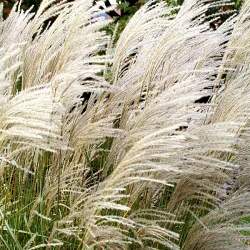Мискантус китайский Graziella (Грациелла). Роскошный и неприхотливый злак. Высота до 150 см. Метелки белые, сохраняются на зиму. Стебли облиственные донизу. Зацветает в июле, цветет продолжительно и необыкновенно пышно.